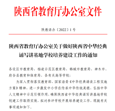 近日,陕西省教育厅办公室发布《陕西省教育厅办公室关于做好陕西省中华经典诵写讲基地学校培养建设工作的通知》(陕教语办〔2022〕1号),经市区教育局遴选推荐、高校和省教育厅直属单位自主申报,省教育厅资格初审,陕西职院被认定为陕西省中华经典诵写讲基地学校培养建设单位。